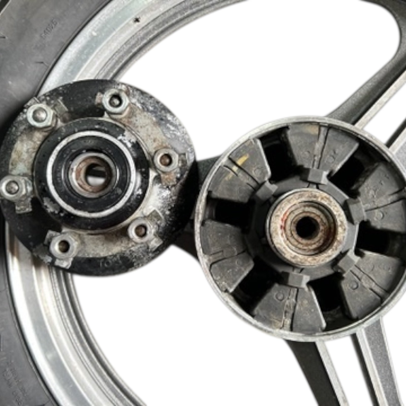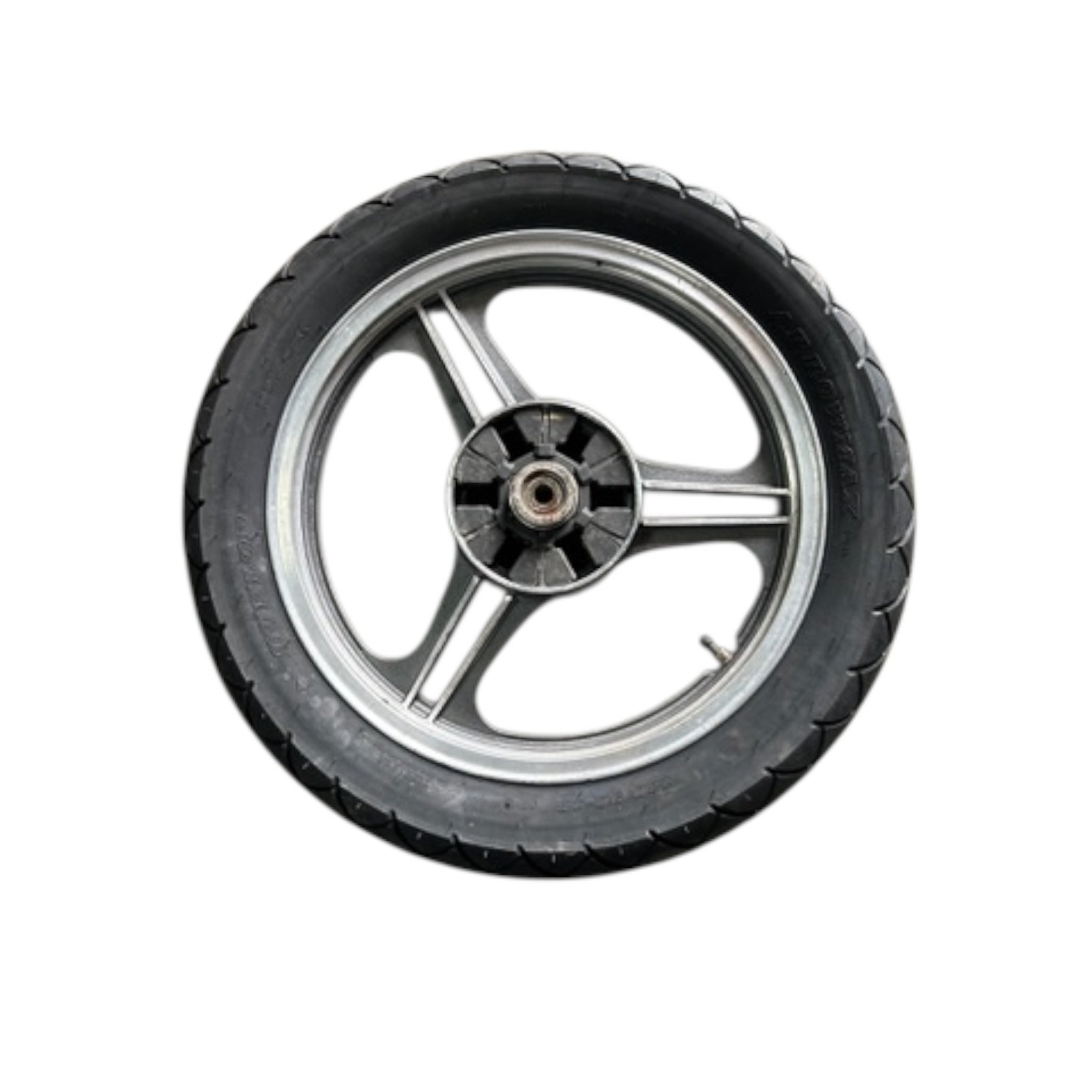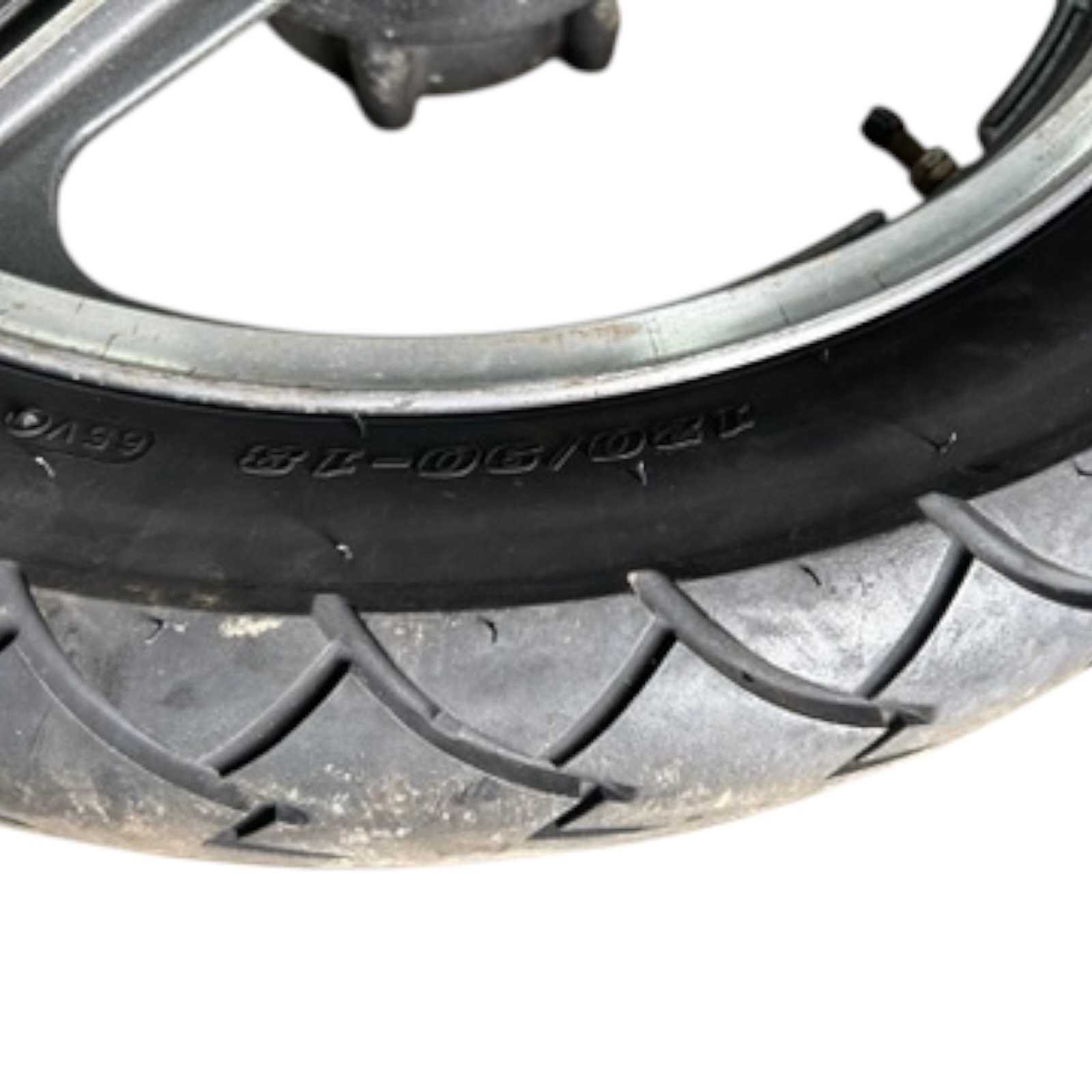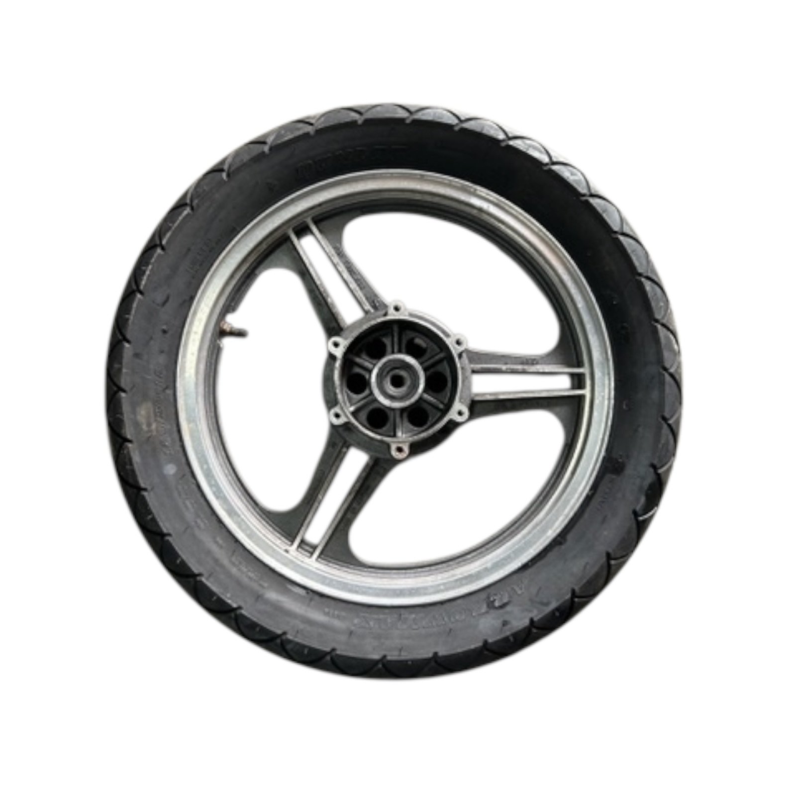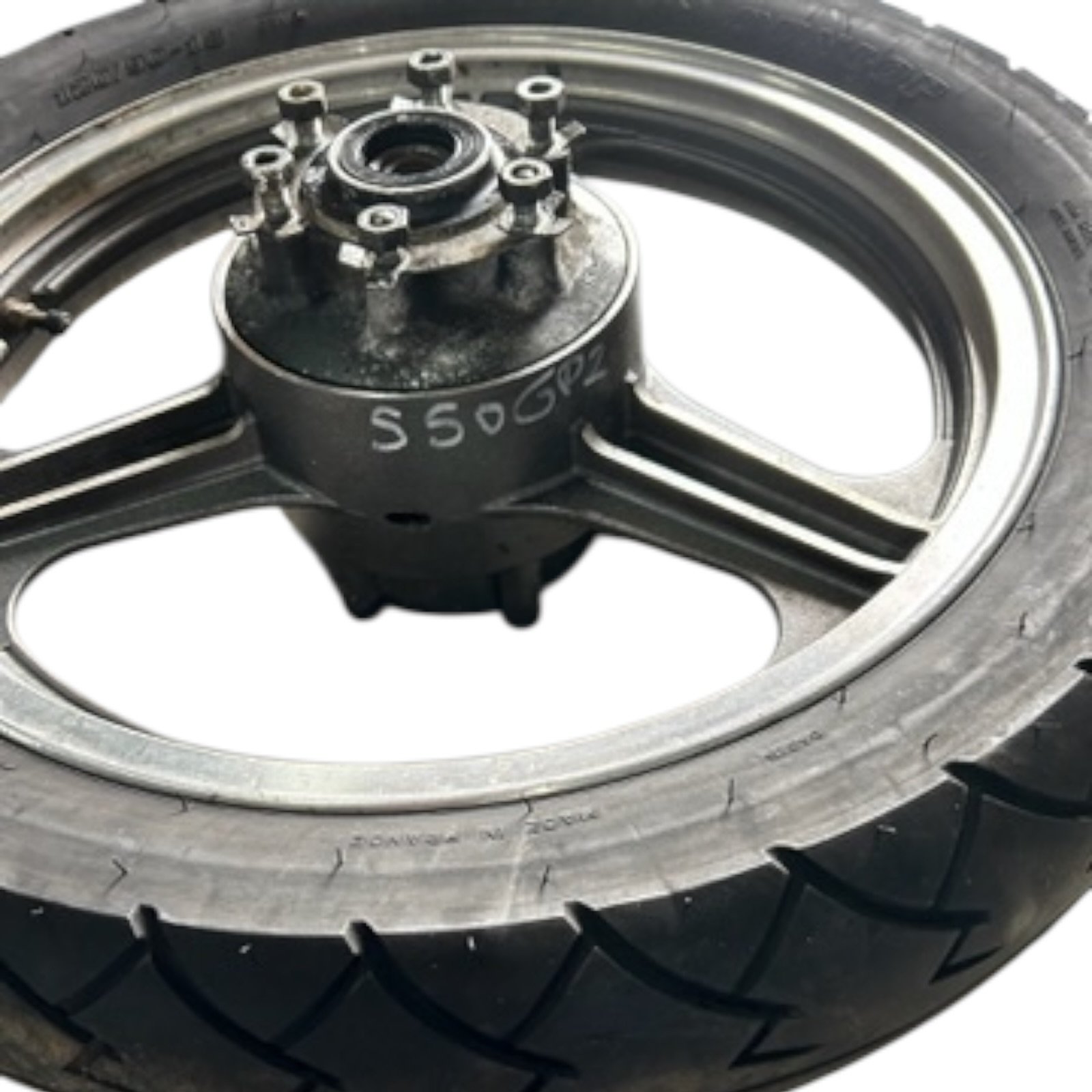 Roue arrière de KAWASAKI 550 GPZ, la jante est en bon état, le pneu est à remplacer.